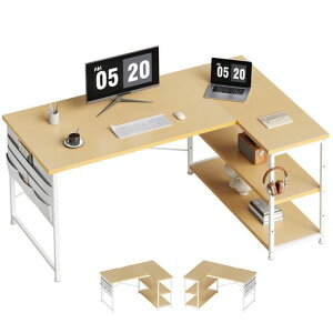 【棚は左右に取り替えができる】L字型の棚の左右も切り替え自由なので、様々なシーンにあわせます。サイドの収納袋の位置もL字型の本棚の位置に合わせて変えることができます。 【十分な収納スペース】広い机の天板とオープンな足元ス