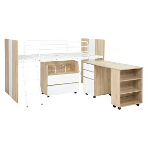 ※こちらの商品はお客様組み立てとなります。 ■内容物 ベッド・デスク・チェスト・シェルフ・ハンガーラック・ブックラック ■サイズ システムベッド時:W201 x D103 x H133cm ベッド:W201 x