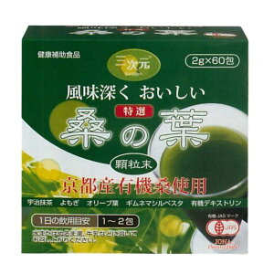 【種類】 健康補助食品 【容量】 60包 【配合主成分】 有機桑の葉末、有機デキストリン、ヨモギ末、抹茶、ギムネマシルベスタ末、オリーブ葉末 【商品の特徴】 化学肥料、農薬を使用せず、京都産の【有機桑の葉】を使用したJAS 認定有機製