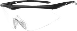耐衝撃性の高いポリカーボネート製透明レンズ一眼型安全メガネ サイドプロテクトデザインで正面・側面からの飛来物防止 ツル長さ調整可 鼻のあたりを和らげるノースパッド レンズは防曇タイプでキズに強く、耐紫外線性に優れます