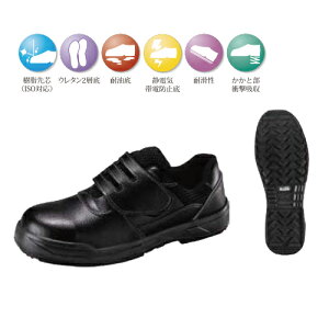 ■特長 優れた人口皮革、先芯性能、耐滑性能、静電気帯電防止性能、かかと部分の衝撃エネルギー吸収性能 ●先芯:樹脂(200J対応) ●甲革:人工皮革+メッシュ ●靴底:発砲ポリウレタン2層底 ●標準重量:860g...