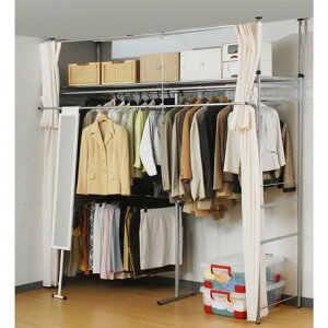サイズ/約幅151〜220×奥行32×高さ208〜270cm 重量/約9kg 内容量/1台 材質/ポール:スチール(メッキ仕上げ) 支柱:スチール(エポキシ樹脂粉体塗装) 耐荷重/ポール:10kg 組立状態/お客様組立品