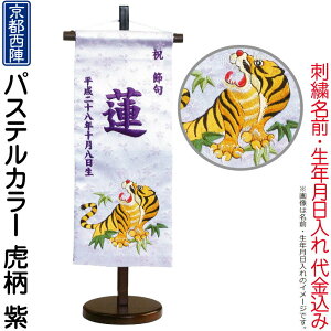 メーカー希望小売価格はメーカーカタログに基づいて掲載していますサイズ:巾12×高さ29(cm) 台付全長40(cm)節句人形優良店パステルカラー 虎柄 紫 京都西陣織 スタンド付 刺繍 名前・生年月日入れ代金込み商品番号:ym-415...