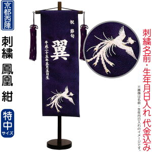 メーカー希望小売価格はメーカーカタログに基づいて掲載していますサイズ:巾15×高さ41(cm) 台付全長57(cm)節句人形優良店鳳凰(特中)紺 京都西陣織 スタンド付 刺繍 名前・生年月日入れ代金込み商品番号:ym-51121【20...