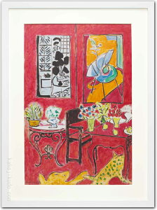 【画 題】赤の大きな室内 【解 説】「色彩の魔術師」とよばれるアンリ・マティスの最後の油彩作品とされるのが【赤の大きな室内】です。この作品に取り組んだ時マティスは78歳、晩年においてもなお、作品への熱意が感じられ、情熱的