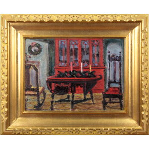 壁とテーブル上に飾り付けられたヒイラギと、赤の格調高い家具静謐で整った室内風景から気品が感じられます。1987年制作技法:油彩画作品サイズ:F8号額のサイズ:高さ55cm×幅67cm×奥行き7.0cm作品の状態:良好です久保守(くぼま...