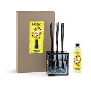 【コンセプト】 エトナ火山の麓 大地に広がる果樹園の恵み太陽をたっぷりと浴びた果物が宝石のように煌めく 【香り】 フレッシュではじけるような果実が煌めく、ウッディーシトラスノートの香り。 花瓶にガラス玉を入れて、フレグラン