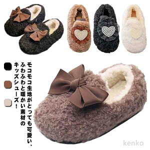 モコモコ生地がとっても可愛い、ふわふわと暖かい素材のキッズシューズモコモコでとってもあたたかいので寒い冬におすすめです。裏地が肌触りがよく、肌の柔らかいキッズでも安心して履きます底面はラバーなのですべりにくくなってい