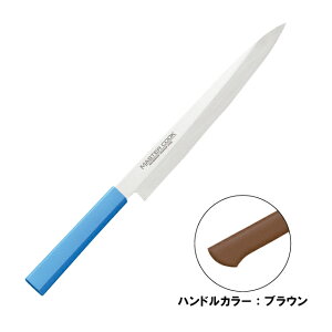 ■包丁の種類 刺身庖丁 ■主な用途 魚介類や刺身などを切るための庖丁。 出刃庖丁と比べるとフォルムは細長く、薄く切る用途に使用します。 ■材質 刃の材質:炭素鋼 板柄の材質:PC輪付朴柄 ■刃長...
