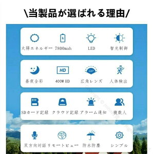 【商品情報】 タイプ:監視カメラ ソーラー 画素数:400万画素 解像度:1600x2500P レンズ:4mm センサー 1/3センチ COMSセンサー 赤外線撮影距離 20~30m Micro SDカード録画 最大128GBまで対応...