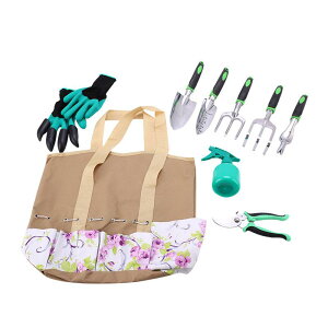・素材: アルミニウム合金・用途: 園芸、幼苗育成・重さ: 約150g・セット内容: 9点セット(大スコップ、小スコップ、熊手、三つ又、根取り器、園芸はさみ、園芸手袋、園芸ツールバッグ、園芸用スプレーボトル)