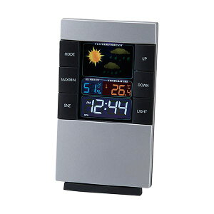 ■商品内容これからの天気予報や温度、湿度がカラー表示されるみやすい多機能時計です。バックライト、音・振動センサー付き。機能:時計、アラーム、スヌーズ、温度計、湿度計、天気予報、カレンダー、バックライト、音・振動センサ