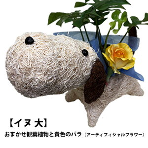 父の日にクリクリとしたお目々がキュートなアニマルバスケット♪観葉植物と黄色い薔薇をセットしてお届けします。 個性豊かな動物たちがバスケットに大変身!のほほんとして、思わず笑顔になっちゃう可愛さです! 季節のお花をセット
