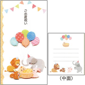ギフト対応 ハンドメイドの 出産祝い祝儀袋 です。 パーツなどを貼り、立体的に飾られた手の込んだデザイン。 動物たちが赤ちゃんの誕生をお祝いする姿がとっても可愛いんです。 本体を開くと中面にメッセージを書くスペースがありま
