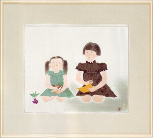 折り鶴を用意している姉妹を描いた作品です 【寸 法】額寸●縦60cm×横67.6cm 【作 家】小倉遊亀(おぐら・ゆき) 【特 典】壁に取り付けるための『金具フック』もお付けします!