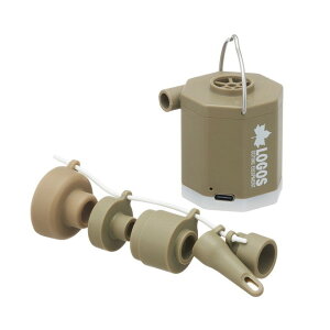 【特徴】超小型ながらもポンプとして十分な能力を備え、エアベッドなどの空気の追加注入や排出時に便利な電動ポンプ。 5種類のノズル付きで、様々なバルブに合わせて使い分け可能。 LEDライト付きで照明としても活躍し、半透明の収納袋