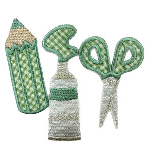 商品について【絵の具1枚、はさみ1枚、えんぴつ1枚の3枚セット】 「目印」ワッペン アイロンで簡単にお手持ちのバッグなどに接着できるギンガムチェック生地アップリケ刺繍のアイロンワッペン。 お子様が自分で準備する練習にもなり、「