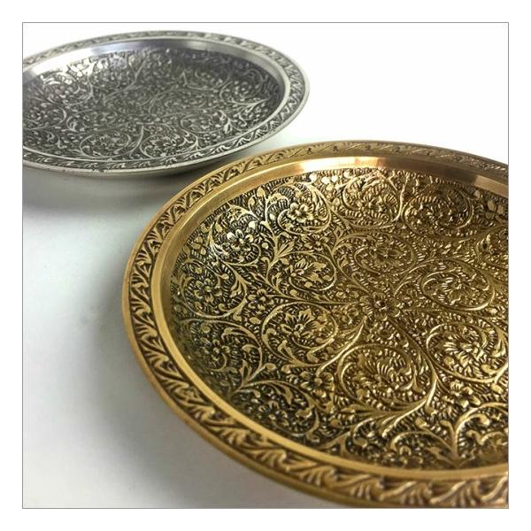 ブラスプレート 使い込まれたような 静かで落ち着いたホワイト真鍮の色合いが 上品でノスタルジックな雰囲気を醸し出す アンティークな雰囲気のプレート プレートの内側には 草花モチーフのレリーフが 隙間なくデザインされており 光の