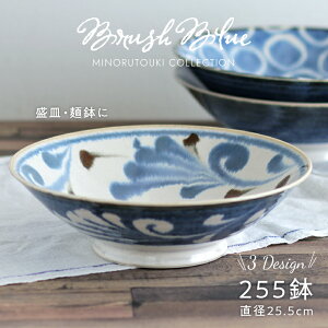 美濃焼のブランド「AWASAKA」による、陶器のような温かみがあるシリーズ「ブラッシュブルー」の25.5cm鉢をご紹介します。盛皿にしたり、1人前の麺鉢としても使いやすい大きさ。 デザインは「点打」「唐草」「百丸」の3種類。季節を問わずお