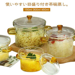 使いやすい目盛り付き茶碗蒸し。耐熱ガラス茶碗蒸し、中身が見えて、陶器製より使いやすい。電子レンジでもガス火でも使える耐熱ガラス茶碗蒸し、プリンやゼリーを作る容器としておすすめ。持ち手とフタの取っ手が琥珀色でチャームポ