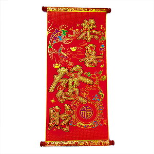 「恭喜発財」の文字描かれている、財運を願う開運の掛け軸。 写真ではわかりづらいですが、キラキラとラメが輝き、華やかで豪華な掛け軸です。 【商品詳細】 ・サイズ 32.5*64cm ・別珍調不織布