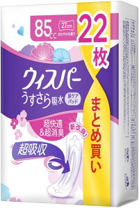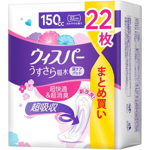 サイズ:22枚×1個◆商品名:大容量ウィスパー うすさら吸水 150cc 22枚(尿漏れパッド 尿とりパッド 女性用)【中量用】超吸収、超快適、超消臭。ぎっしり詰まった強力吸収体だから、しっかり吸収。ギャザーが高くなった...