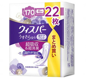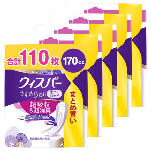 110枚◆商品名:まとめ買い・大容量ウィスパー うすさら安心 170cc 110枚 (22枚×5パック) (尿漏れパッド 尿とりパッド 女性用)【中量用】超吸収、超快適、超消臭。ぎっしり詰まった強力吸収体だから、しっかり吸収。ギャザー...