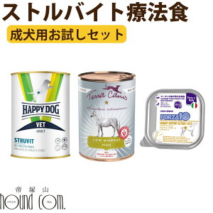 HAPPY DOG VET ストルバイト(尿石ケア)ウェット缶は、ストルバイト結石症の愛犬のために成分調整された食事療法食です。マグネシウムとリンの含有量を制限し、メチオニンなど尿pH値を酸性化する原材料を使用したレシピで...