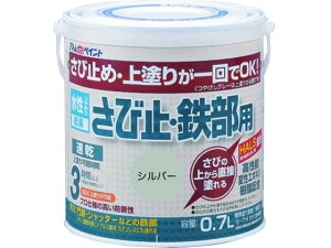 水性さび止・鉄部用 0.7L シルバー 用途:鉄骨・鉄扉・門扉・フェンス・物置・シャッター等の鉄部、トタン(屋根を除く)、アルミ建材、ステンレス等の上塗り兼用さび止め 塗り面積:約5~7m2(畳枚数換算:約4枚)(1回塗りさび