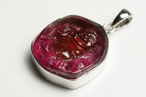 美しいピンクに発色した宝石質ピンクトルマリンの原石の表面に布袋様彫刻をしておりますペンダントが初登場でございます。大変、ご利益のありそうで贅沢なペンダントです。 トップ部分:1.9×1.6×0.7cm