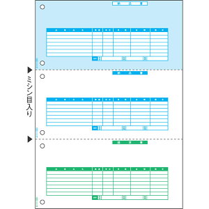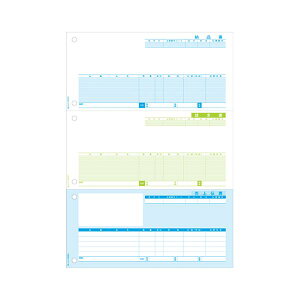 レーザープリンタ用帳票。A4サイズ3分割(納品書/納品書/請求書) その他の納品書はこちらから 入数 500枚 サイズ A4タテ 210×297mm ミシン目切り離し後のサイズ 210×99mm 複写枚数 3