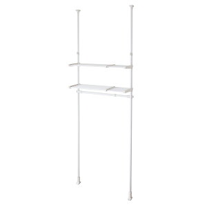 収納を増やして活用できるつっぱり棚。サイズ:大寸法:W75〜120×D23.5×H3.3cm。色:ホワイト。材質:パイプ・棚:鉄(エポキシ樹脂粉体塗装)、樹脂部品:ABS。