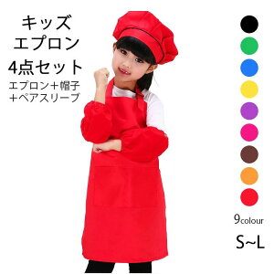 子供用エプロン 帽子付き ペアスリーブ付き 4点セット 100以下 100 120 150 無地 エプロン キッズ 子供 子どもエプロン 男の子 女の子 ゴム 小学生 こども 子ども かぶるだけ