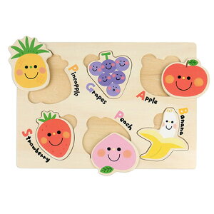 ちいさな子でも遊びやすい木製フルーツパズルです。かわいいフルーツが木製パズルになりました。ちいさな子でもピースが取り外しやすいように指を入れる枠が付いています。フルーツの名前と色もいっしょに学べます。対象年齢 : 2歳〜セ