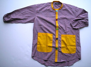 図工スモック お父さんYシャツをリフォームしたスモック(黒とサックスと白とエンジのストライプ地に黄色柄)(小学生サイズ)入園 入学 幼稚園 保育園 小学校(詳細) ●素材:Yシャツ形状安定素材 ●色:黒とサックスと白とエンジのス