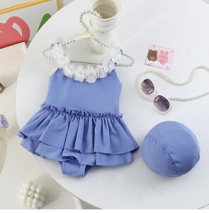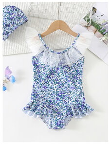 商品紹介: 夏の楽しい水遊びにぴったりな、女の子用の可愛らしいワンピースロンパースが登場しました!2点セットの帽子付きで、日焼け対策もバッチリ。スイムキャップも含まれている
