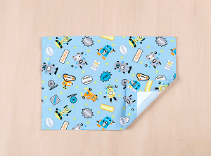 氏名票は裏についています。縦35cm横50cm。学校の机ぐらいの大きさ。 同柄でサイズ違いがあります。 氏名票(名札)が最初から縫い付けてありますので、