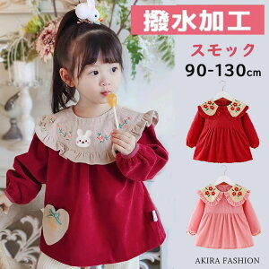 90-120cm!洗濯しやすい・汚れに強い防水加工のキッズスモックお洋服のような可愛いデザインの長袖スモック、女の子が大好きに間違いなし。可愛いスカラップ襟に繊細な刺繍が施され、まるでおしゃれなブラウス。外出時恥ずかしくないお