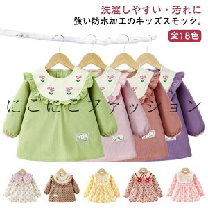 【全18色】洗濯しやすい・汚れに強い防水加工のキッズスモック。お洋服のような可愛いデザインの長袖スモック、女の子が大好きに間違いなし。可愛いスカラップ襟に繊細な刺繍が施され、まるでおしゃれなブラウス。外出時恥ずかしくな