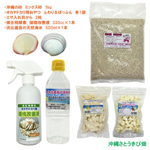 【商品内容】 ・沖縄の砂 ミックス砂 1kg ・オカヤドカリ用おやつ ふわり&ぽっぷん 各1袋 ・エサ入れ貝がら 2枚 ・微生物酵素 環境改善液 330cc×1本 ・浜比嘉島の天然海水 500ml×1本...