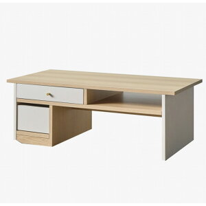 リビングテーブルとしての機能だけでなく、DVDやティッシュ、雑誌が収納できるオープン部、リモコンなどを収納できる引き出し付き。丸みのある北欧風のデ