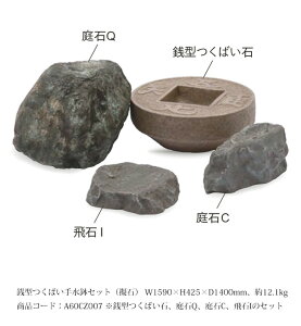 軽くて丈夫なFRP製・銭型つくばいと庭石のセットです。日本庭園アイテムとして活用いただけます。人工庭石は単品でも販売しております。