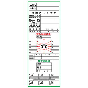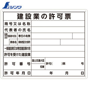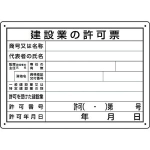 取寄せ品の為2〜3日(稼働営業日発送)【特長】●建設業法等により、現場への掲示が義務付けられている標識です。●空欄部分に必要事項を記入し掲示することで、工事・建設作業等に伴う許認可を明示します。【用途】●当該情報の明示