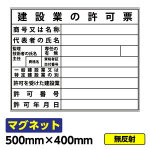 工事看板 安全掲示板 マグネット「建設業の許可票」500×400mm マグネットシート サイズ : 500mm×400mm 材質 : マグネット ※こちらのタイプは無反射です