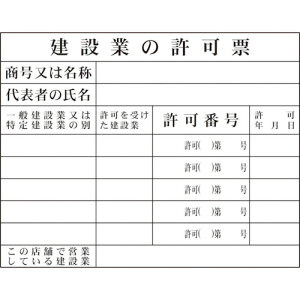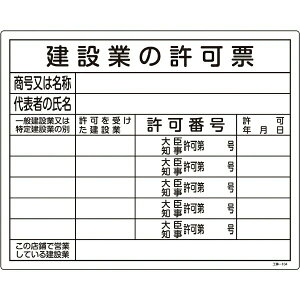 【商品説明】●各種法令表示の徹底に使用します。【仕様】●型番:1149010402 ●表示内容:建設業の許可票 ●取付仕様:穴ナシ(加工フリー) ●縦(mm):400 ●横(mm):500 ●取付方法:ビスまたはテープ止め(ビス...