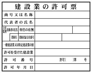 工事・建設作業等に伴う許認可を明示します。 【用途】 当該情報の明示に。 【仕様】 表示内容:建設業の許可票 取