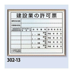 建設工事に必要な法令許可内容を掲示する標識です。【仕様】●型番:302-03B ●表示内容:建設業の許可票 ●取付仕様:穴4ヵ所 ●縦(mm):400 ●横(mm):500 ●厚さ(mm):1 ●取付穴径(mm):4...