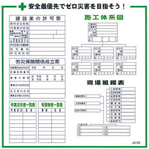 m 材質ポリセームポリセーム製なので軽量で柔らかく貼り付け場所を選びません。この標識には、「建設業の許可票」「労災保険関係成立票」「作業主任者一覧」「有資格者一覧表」「施工体系図」「現場組織表」が含