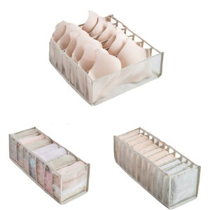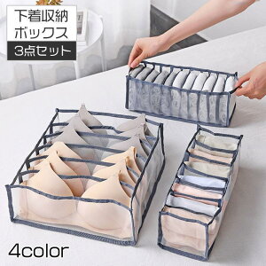 下着収納に困らない仕切り付き下着収納ケース3点セット。7仕切り+11仕切り+6仕切りの3点セットだから様々なサイズに対応できる。仕切りには通気性の良いメッシュ式。使わないときは畳めるので場所も取りません...