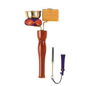 立ったまま鳴らすのに便利な形の携帯用おりん。 印金とも引磬とも書き、これで「いんきん」と読みます。 しっかりとした柄があるので鳴らしやすく 外での法要や巡礼にも安心です。 杢魚がセットになっています。りん棒は本体に収納でき